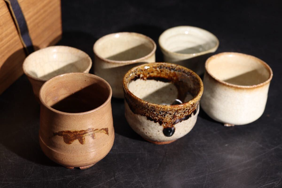 - 時代 古唐津 絵唐津 煎茶碗 六客 木箱付 / 時代物 唐津 茶器 煎茶道具 煎茶飾 .G2095
