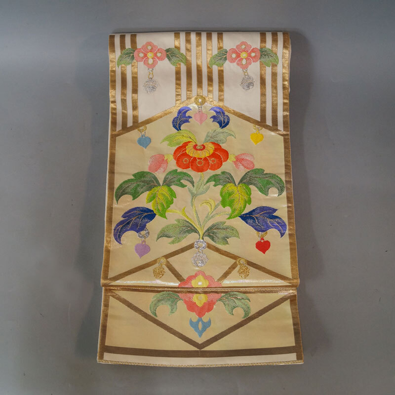 - ye12 三代目 龍村光峯 天平の馨り 本袋帯 六通柄 落款 正絹 金糸 銀糸 花 鈴 たつむら 高島屋 着物 最高級 仕上がり品 着物帯 和服 和装