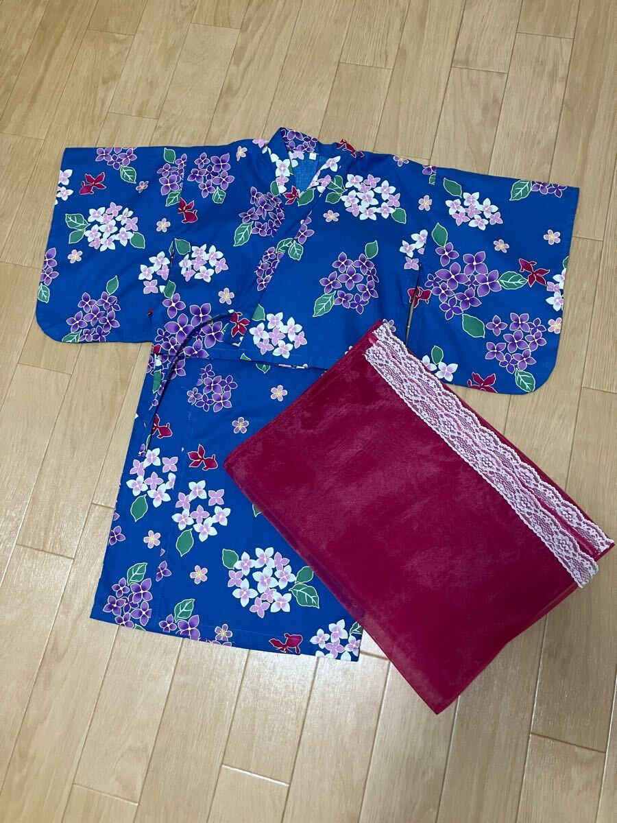 - 訳あり★USED★ニシキ【ガールズ浴衣】110cm/紫陽花×金魚/青色/レース付きシフォン帯