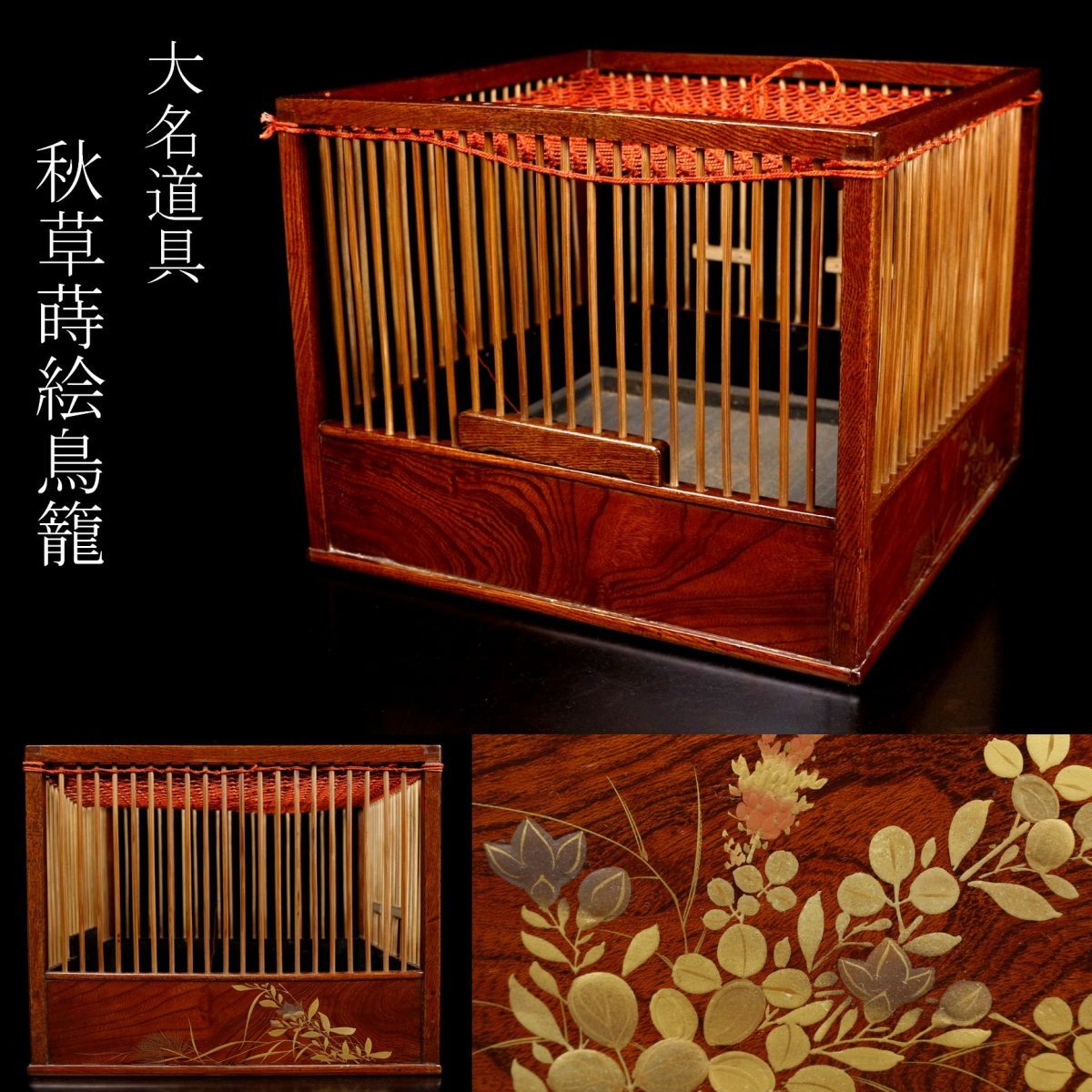 - 【LIG】大名道具 秋草蒔絵鳥籠 29.5㎝ 欅材 竹細工 古美術品 [.ET]25.2