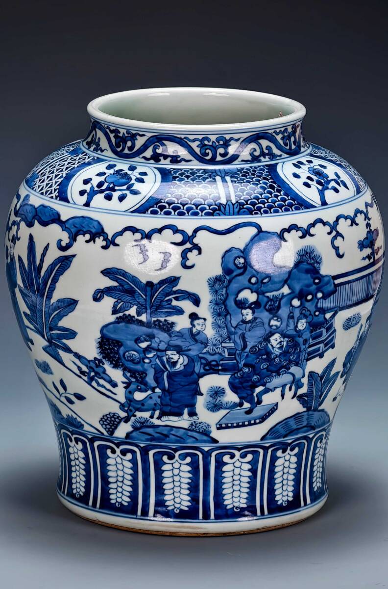 > 多宝閣 ■ 205623 人間国宝 中国磁器【嘉靖年間に作られた、明朝風の人物や物語が描かれた青白磁の壺】施釉陶 陶芸 置物 收藏品 孤品