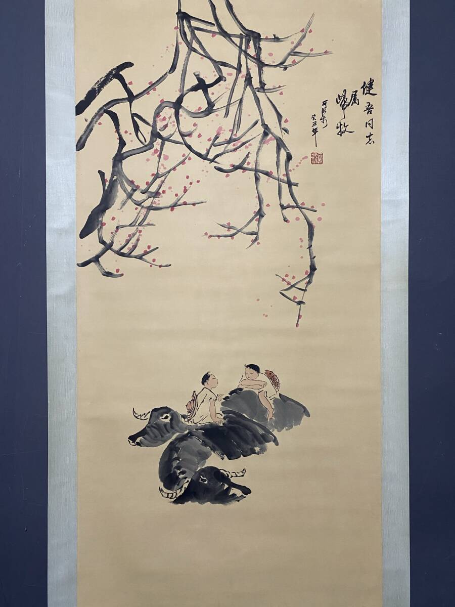 - 唐物 中国古画【李可染 牧牛画】中堂画 純手繪画 画工細膩 表装する精美 宣紙 水墨画 挂軸 極細工 古美術品 時代物 中国古玩 骨董品 D67
