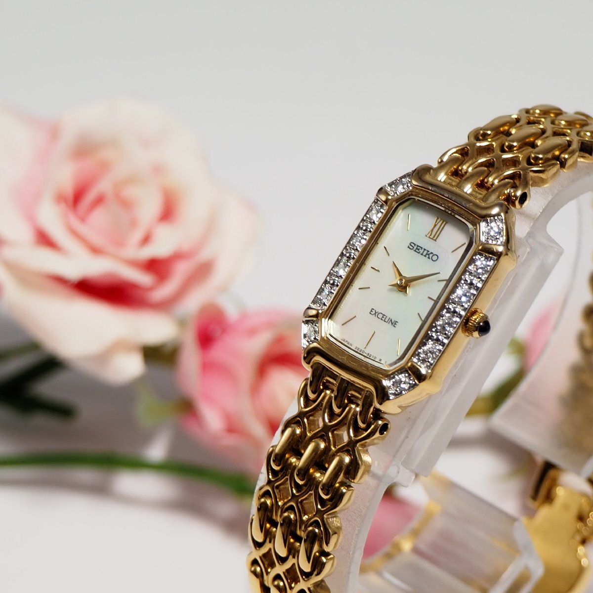 > 美品 エクセリーヌ セイコー SEIKO ダイヤベゼル ホワイト系シェル文字盤 レディース 腕時計 ゴールド H100 中古