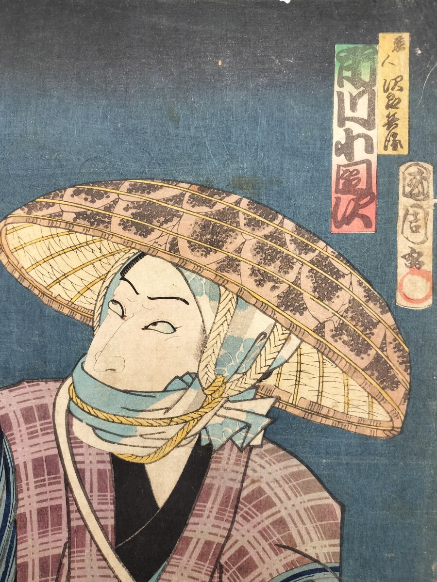- 明治期/真作 豊原国周「市川小団次」本物浮世絵木版画 役者絵 歌舞伎絵 芝居絵 錦絵 大判 台紙付き