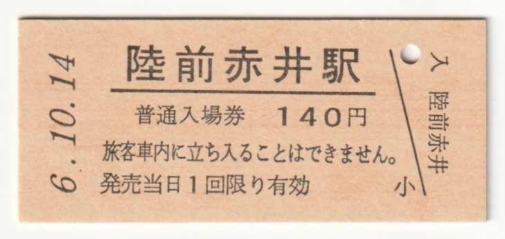 - 平成6年10月14日 仙石線 陸前赤井駅 140円硬券普通入場券(日付印刷)