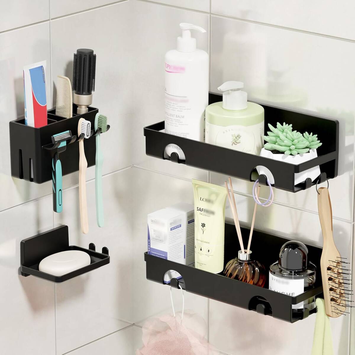 - たっぷり収納 ボトルが倒れない仕切り付き 浴室用ラック 粘着式 お風呂 収納 4個セット 水がしっかり切れる