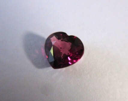 赤いテリがキラキラしているハート形ロードライトガーネットです。少し紫味がある赤です。インクルージョンがありますが、透明感とテリがあります。非加熱。