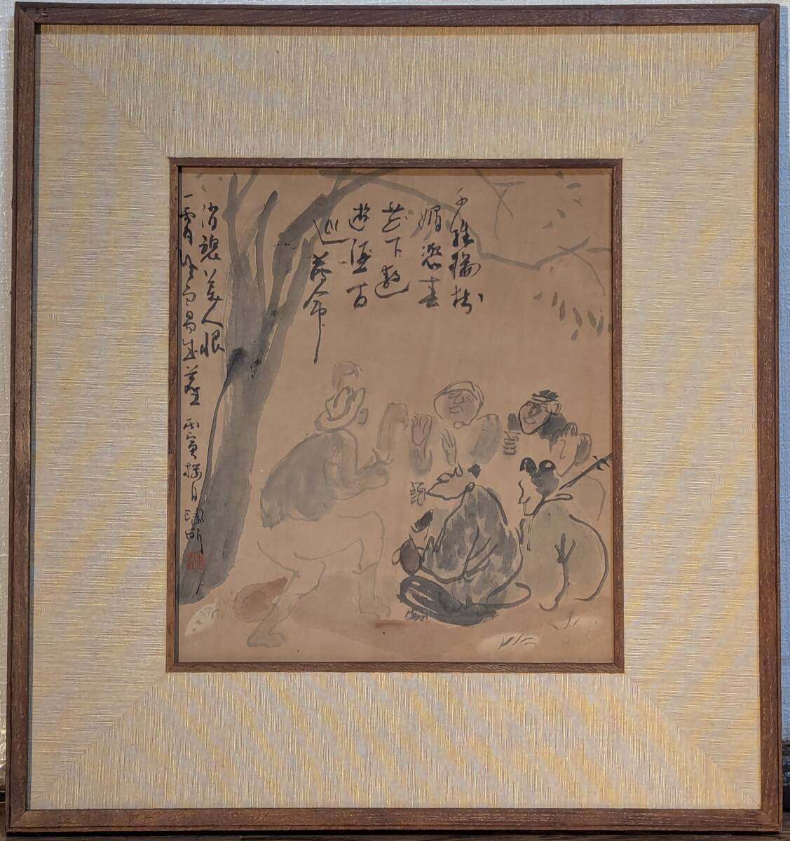 - 【真作】絵画 日本画(色紙) 酒席の賑わい 文人墨彩画 漢詩と人物群像 Y74