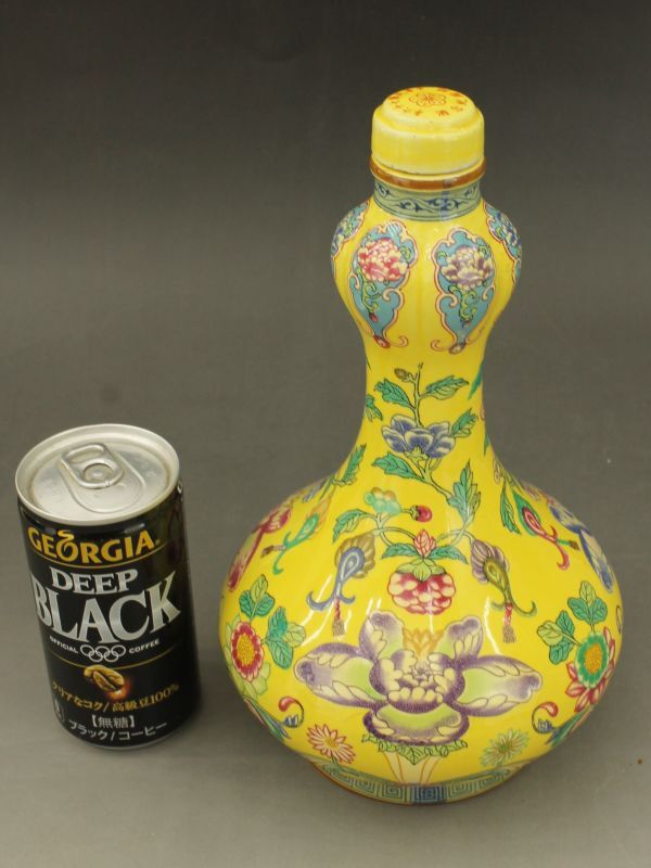 > D512 空瓶 陶器製酒瓶 色絵 瓢箪型 黄地草花紋 中華民国七十六年 開國記念酒 高さ23㎝ 瓶 empty bottle 藏出し 古玩 珍蔵