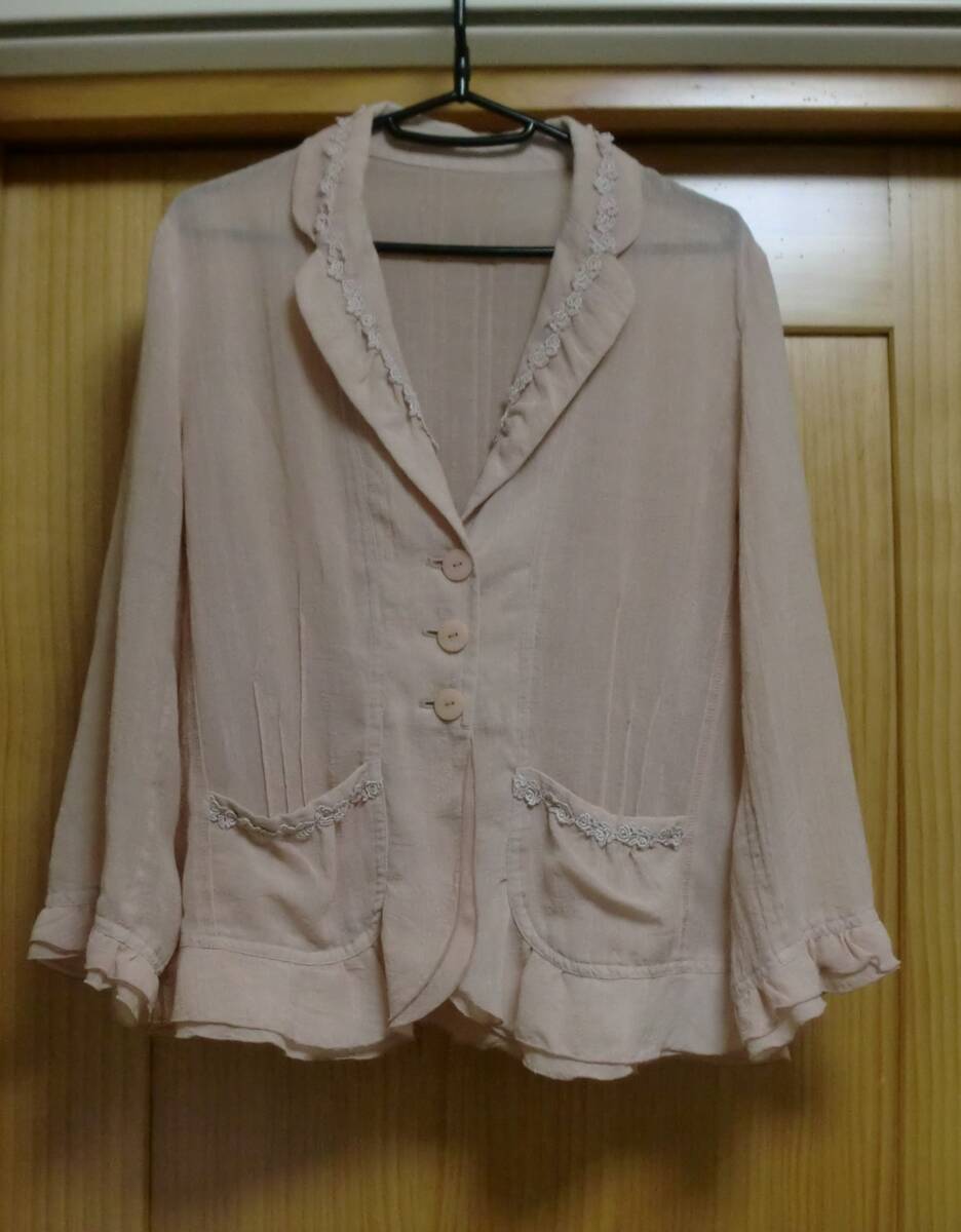 - 大きいサイズLL■ フリルシースルージャケット ■花レースライン 上品薄ピンク色 数回程度着用品 送料230円