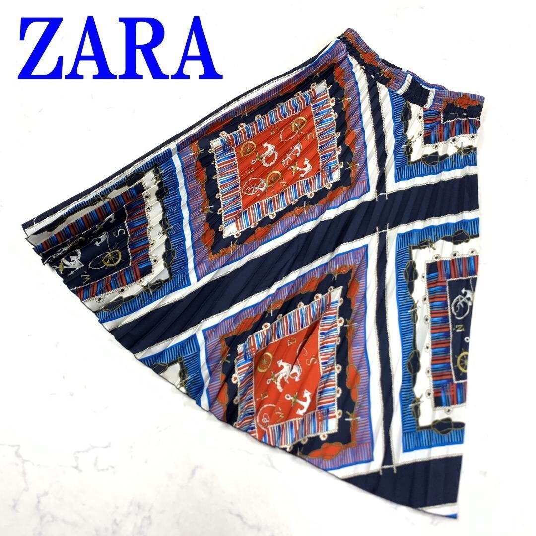 - ZARA ザラ 柄スカート ネイビー 紺 ポリエステル系 スカーフ柄 プリーツスカート M C3247
