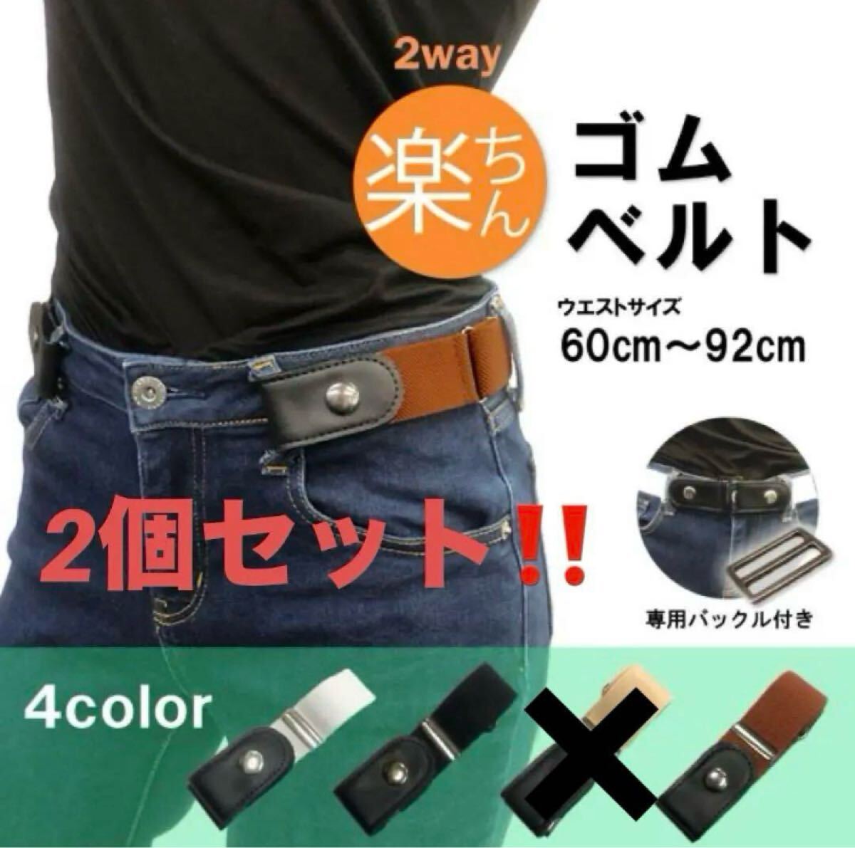 > 2個!500円★ワンコイン!【ゴムベルト】ノーバックル 穴なし シンプル ベルト 簡単 男女兼用 ウエスト アジャスター 訳あり新品 送料無料
