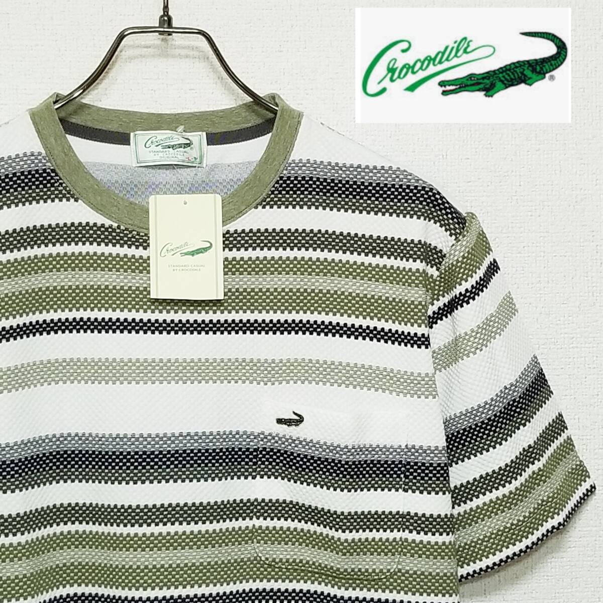 - 【未使用】◎ CROCODILE クロコダイル/ 半袖 ワンポイント刺繍ロゴ クルーネック ボーダー Tシャツ カットソー SIZE: L モスグリーン