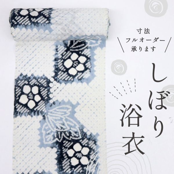 - 【しぼり】 浴衣 反物 市松の花模様 灰青 お仕立て可 夏着物 反25-34