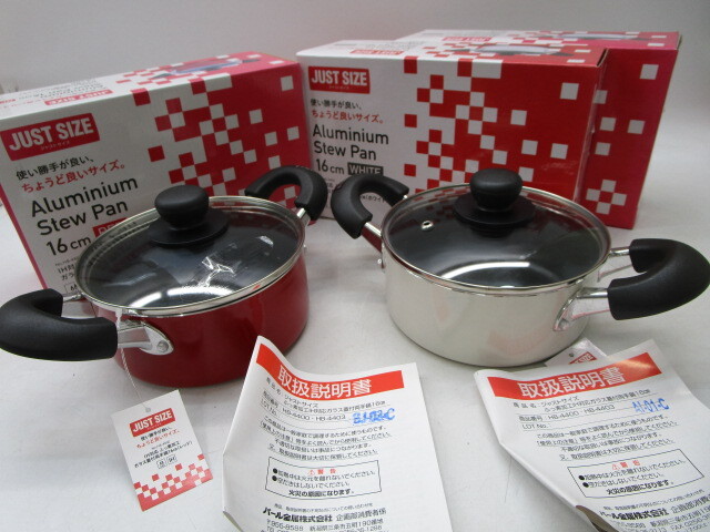- ★大0438 ジャストサイズ 両手鍋 3点まとめて IH対応 ガス ふっ素加工ガラス蓋付 16cm 1.4L ホワイト 2点/レッド 1点 鍋 調理器具 32506032