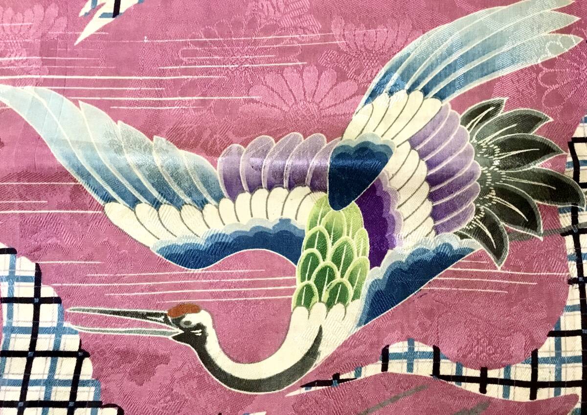 - 古布854・絹ハギレ(カラフルな鶴) 時代着物地