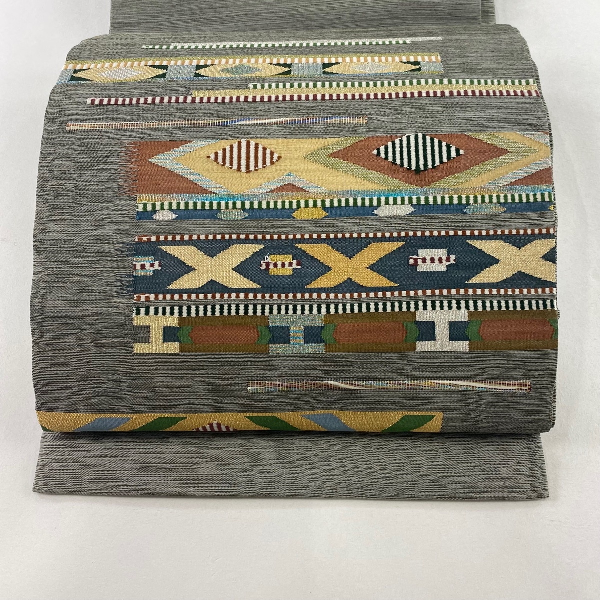 - 袋帯 秀品 菱 段縞 金銀糸 灰緑 お太鼓柄 正絹 【中古】