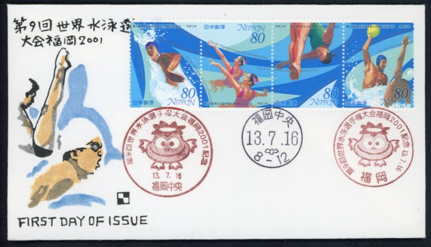 - "0665 【FDC】第9回世界水泳選手権大会福岡2001[福岡中央/13.7.16 /渡辺版](解説書なし)"