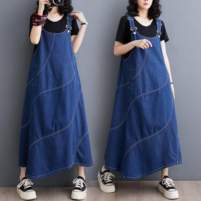- 新入荷大人のデニムサロペットスカート レディース ワンピース ジャンパースカート ロング 無地 長さ調整可 デニムワンピース M