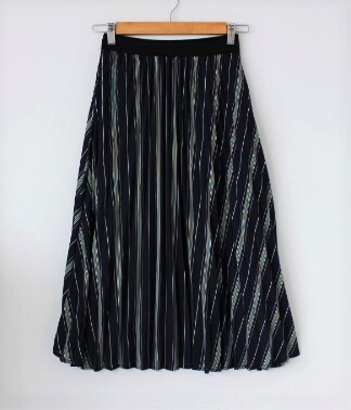 > 美品*紺×黄×緑×白*ストライプ柄*シフォン*ウエストゴム*プリーツフレア*ロング*スカート*ウエスト64-70*M*レディース