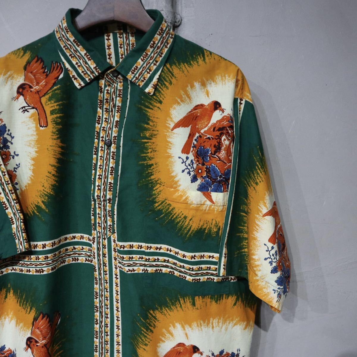 - 【即決】ヴィンテージ プルオーバー シャツ 鳥 民族柄 総柄 緑 グリーン 古着 ヴィンテージ ビンテージ
