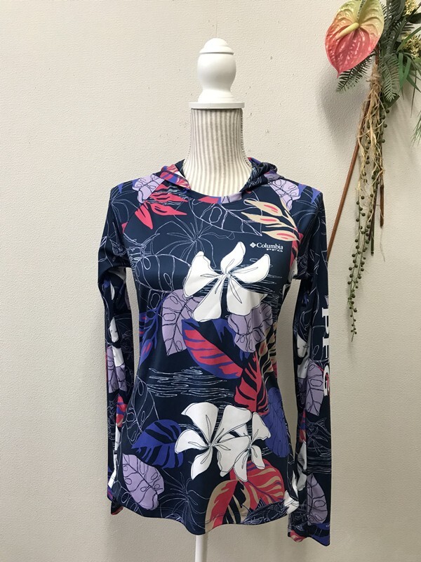 - 4366 レディース 【Columbia】 スポーツウェア フード付き 長袖 サイズ:XS 色:ネイビー花柄入り