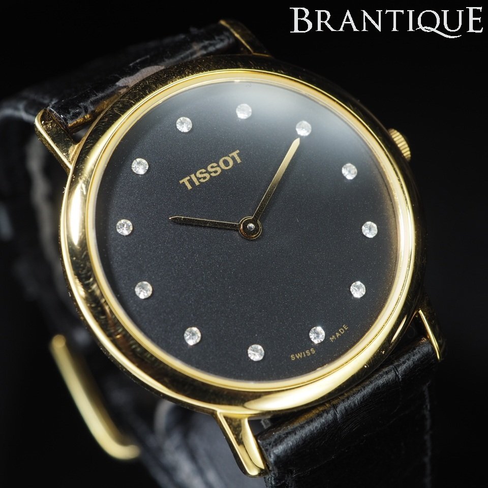 > ◆即決あり◆ TISSOT ティソ GP/革 QZ 透明石 電池交換済み 黒文字盤 ラウンド ケース USED品 稼働 腕時計「27407」
