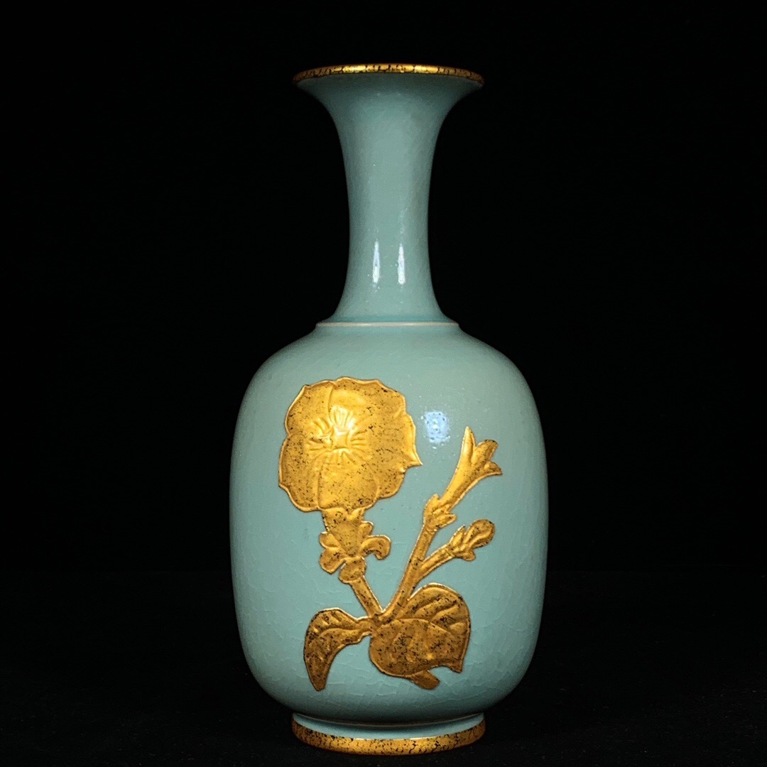 - 蔵友旧蔵出 宋 汝窯 包口 金嵌 花卉紋 賞瓶 稀少珍品 貴重品 古陶瓷品 置物 古賞物 中国古玩 中国古美術品