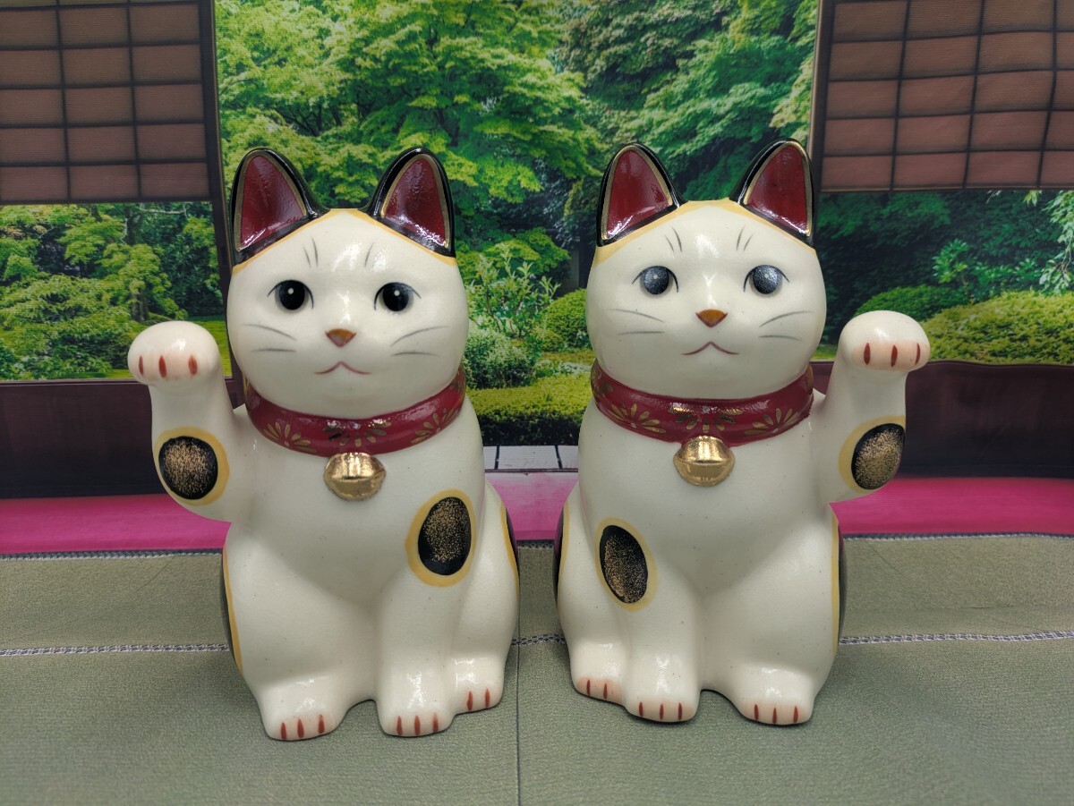 - 招き猫 陶彩菊花招き猫 赤右手上げ大 赤左手上げ大 2種セット 薬師窯