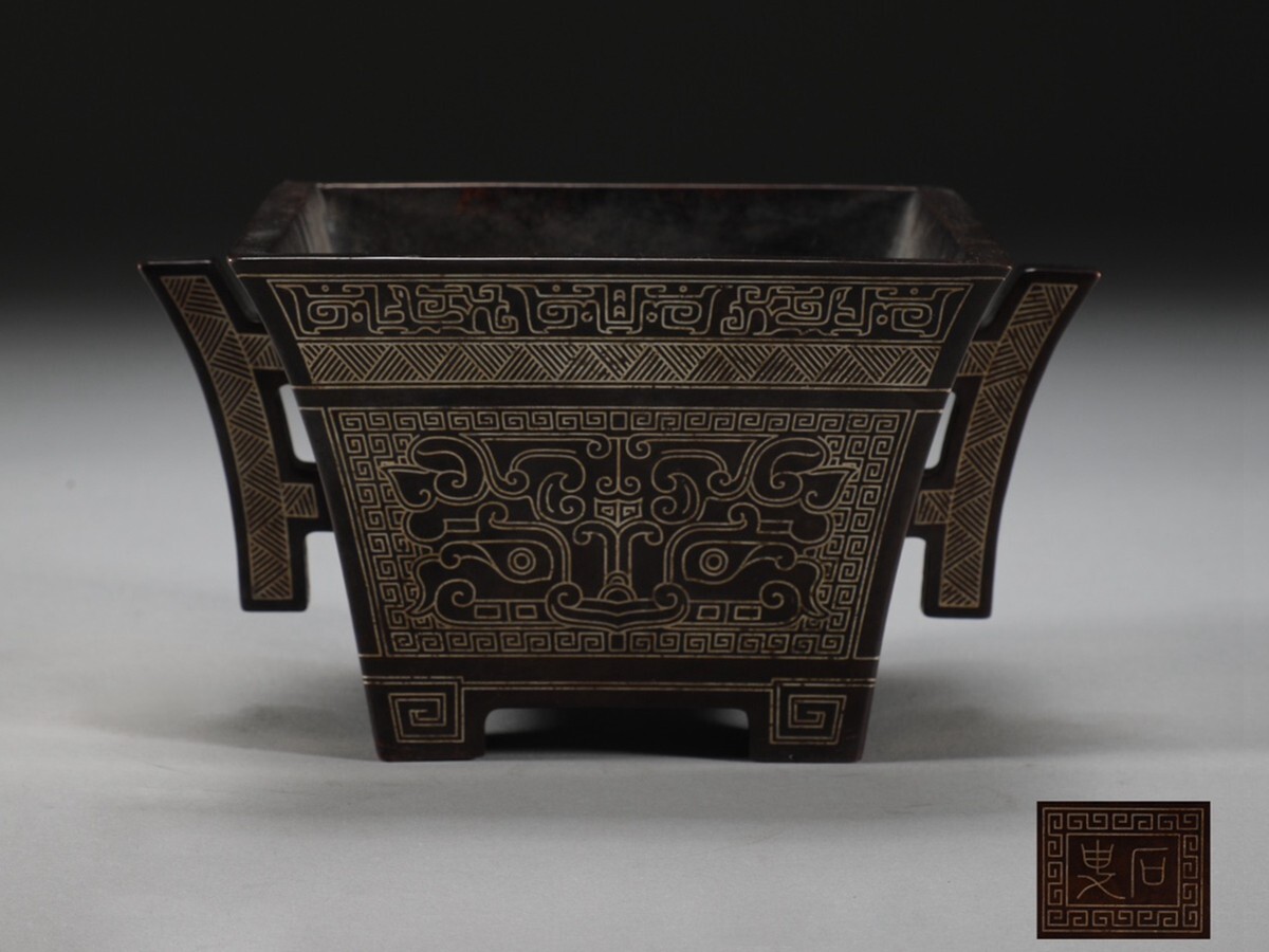 - 「明代 石叟 古銅彫 錯銀絲獣面紋四方鬥式老銅戟耳炉」旧銅器 置物擺件 賞物 中国古美術 旧蔵出