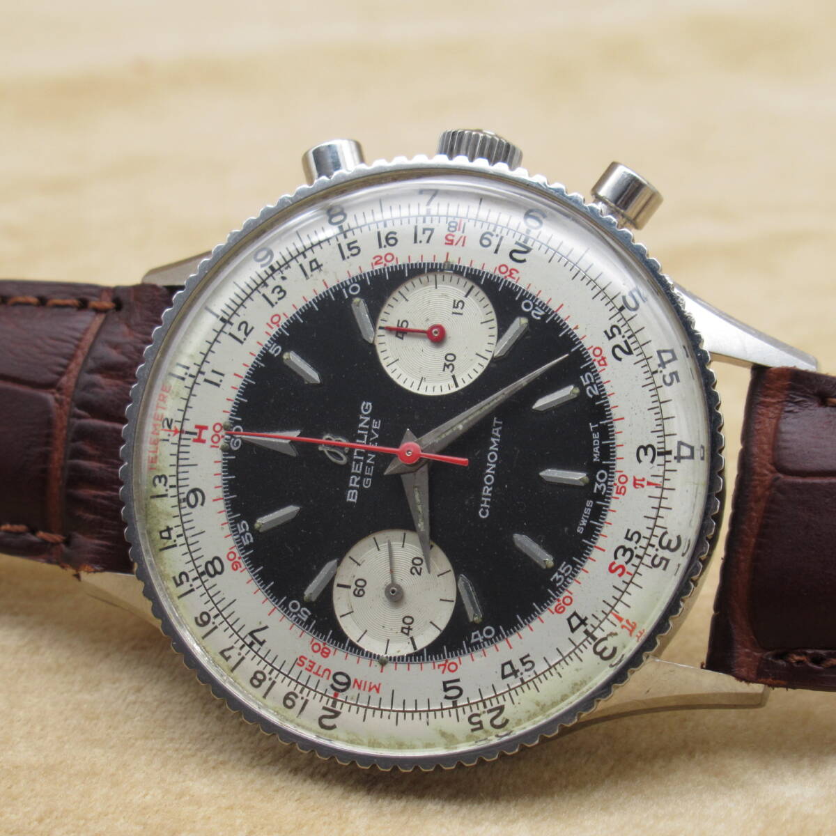 - 【内部点検済】BREITLING CHRONOMAT クロノマット 217012 Ref.808 Venus175 キャリバー 黒文字盤 クロノグラフ 2つ目 シルバー レザー 革