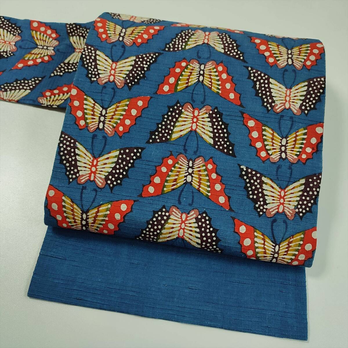 - 即決■着物の越田■幅31長さ354.6 紬 名古屋帯 名古屋仕立て 片面全通 タレ部分は無地です 蝶 バタフライ かわいい 華やか 頭巣◇み07J06