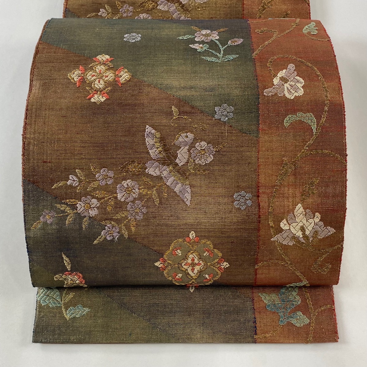 - 袋帯 美品 秀品 花喰いどり 草花 金糸 箔 茶緑色 六通 正絹 【中古】