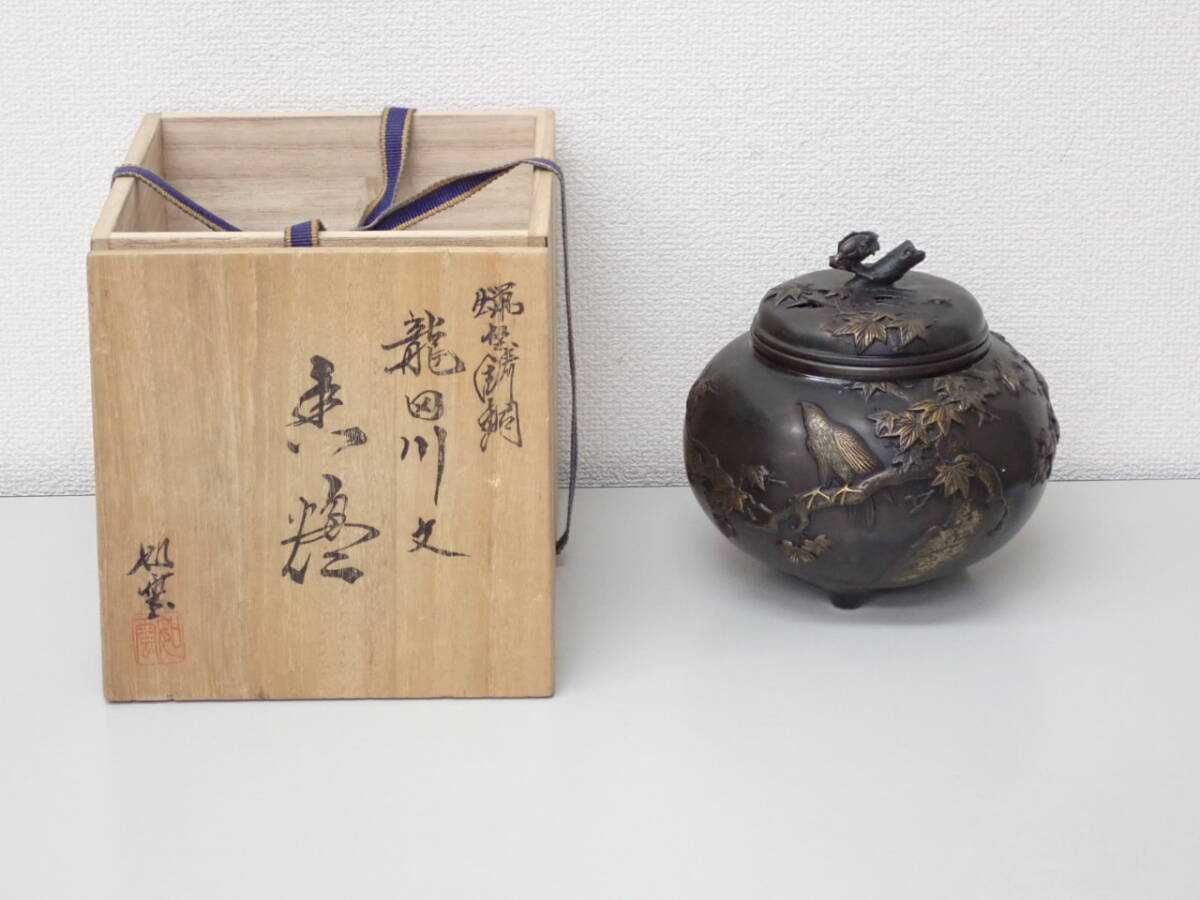 > 262-; 大島如雲 香炉 蝋型鋳銅 龍田川文 約2406.7g 高さ;約14×胴径;14.6×口径;8.3cm 共箱付き ★