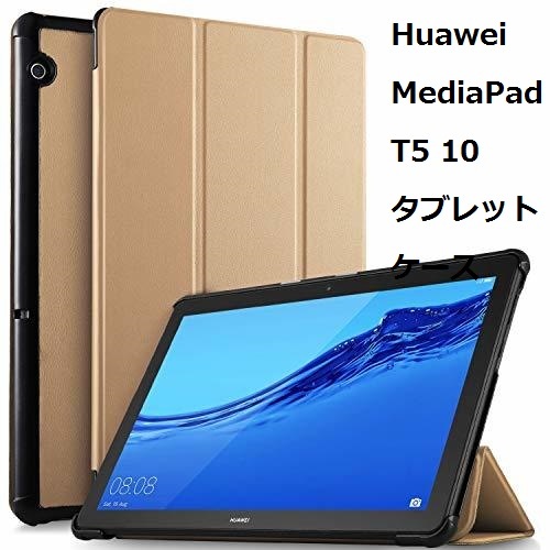 > #DCIJ Huawei MediaPad T5 10 タブレット ケース 新型 NEWモデル スタンド機能付き 保護ケース 三つ折 薄型 超軽量 全面保護型 ゴールド