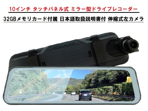 > ミラー型ドライブレコーダー 10インチタッチパネル式 32GB SDカード付属 日本語取説付 伸縮式左カメラ ブルーミラー 1080PフルHD 170°広角