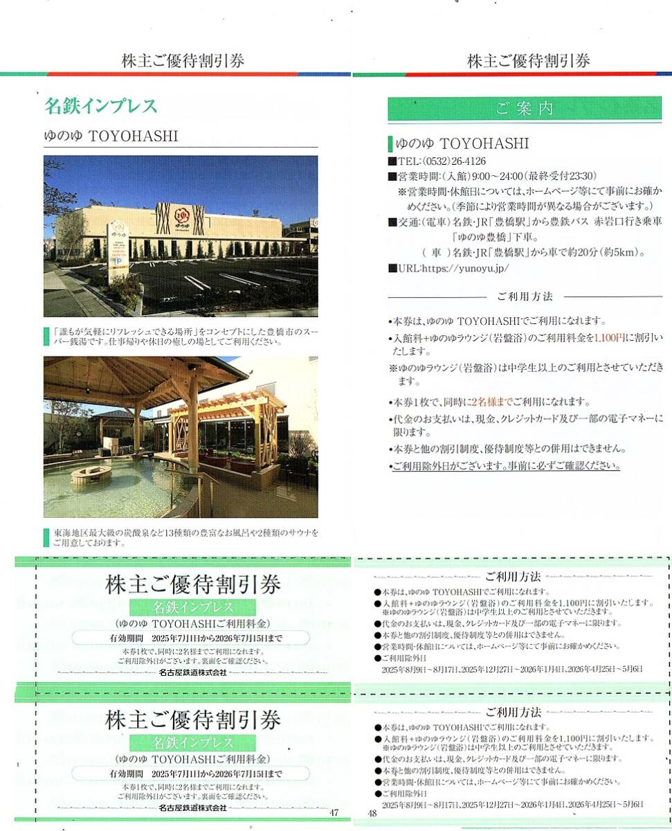 - 名古屋鉄道(名鉄)株主優待券 ゆのゆ TOYOHASHI 割引券 8枚set 2026年7月15日迄有効