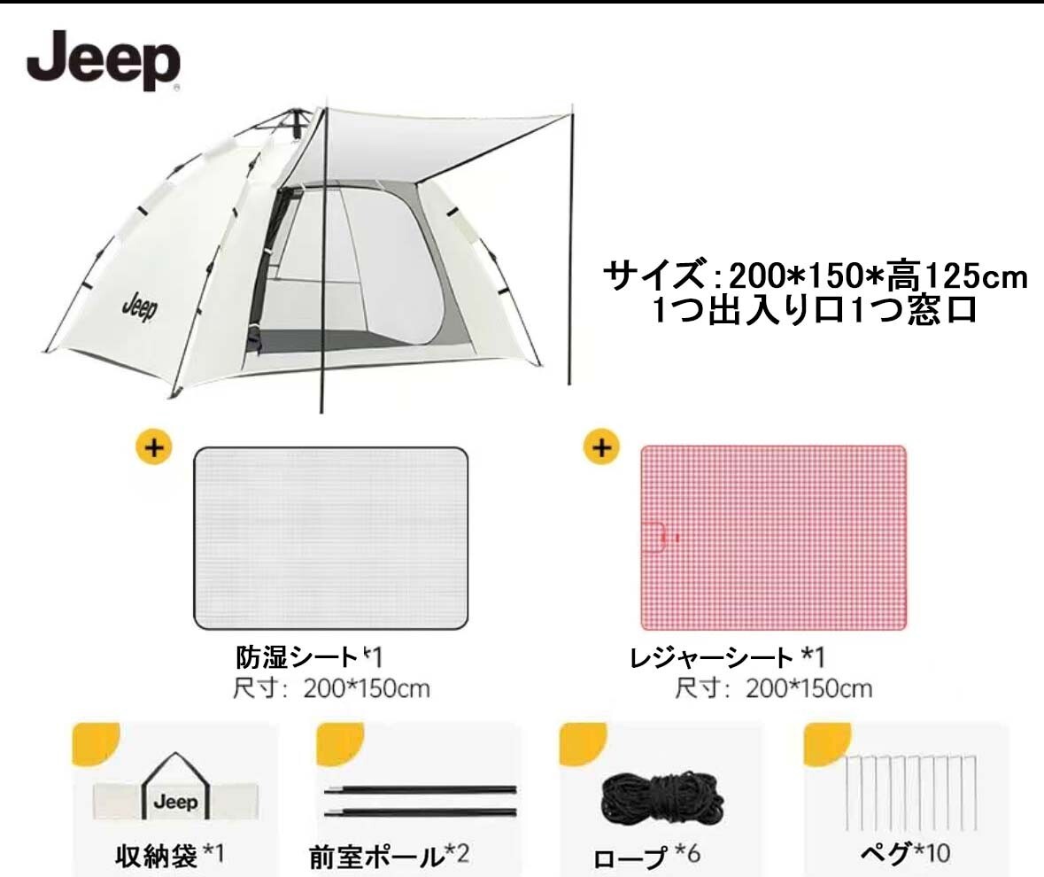 > Jeep テント ワンタッチテント 2~3人用 uvカット加工(1つ出入り口1つ窓口)防湿シートとレジャーシート付き JP11FD