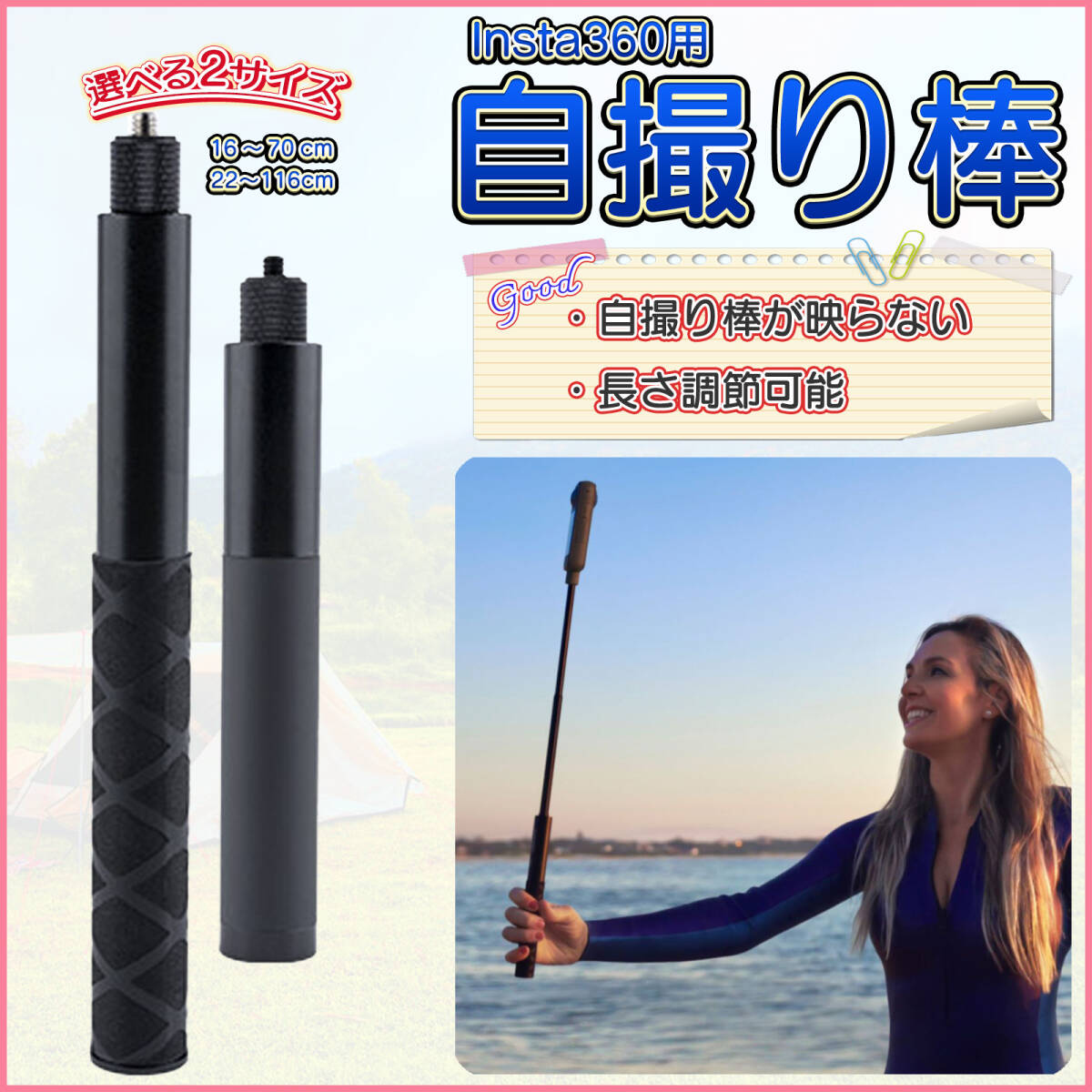 > Insta360 見えない自撮り棒 セルカ棒 セルフィー インスタ360 X4 X3 ONE X2 X EVO 1/4インチネジ 16-70cmに調節可能