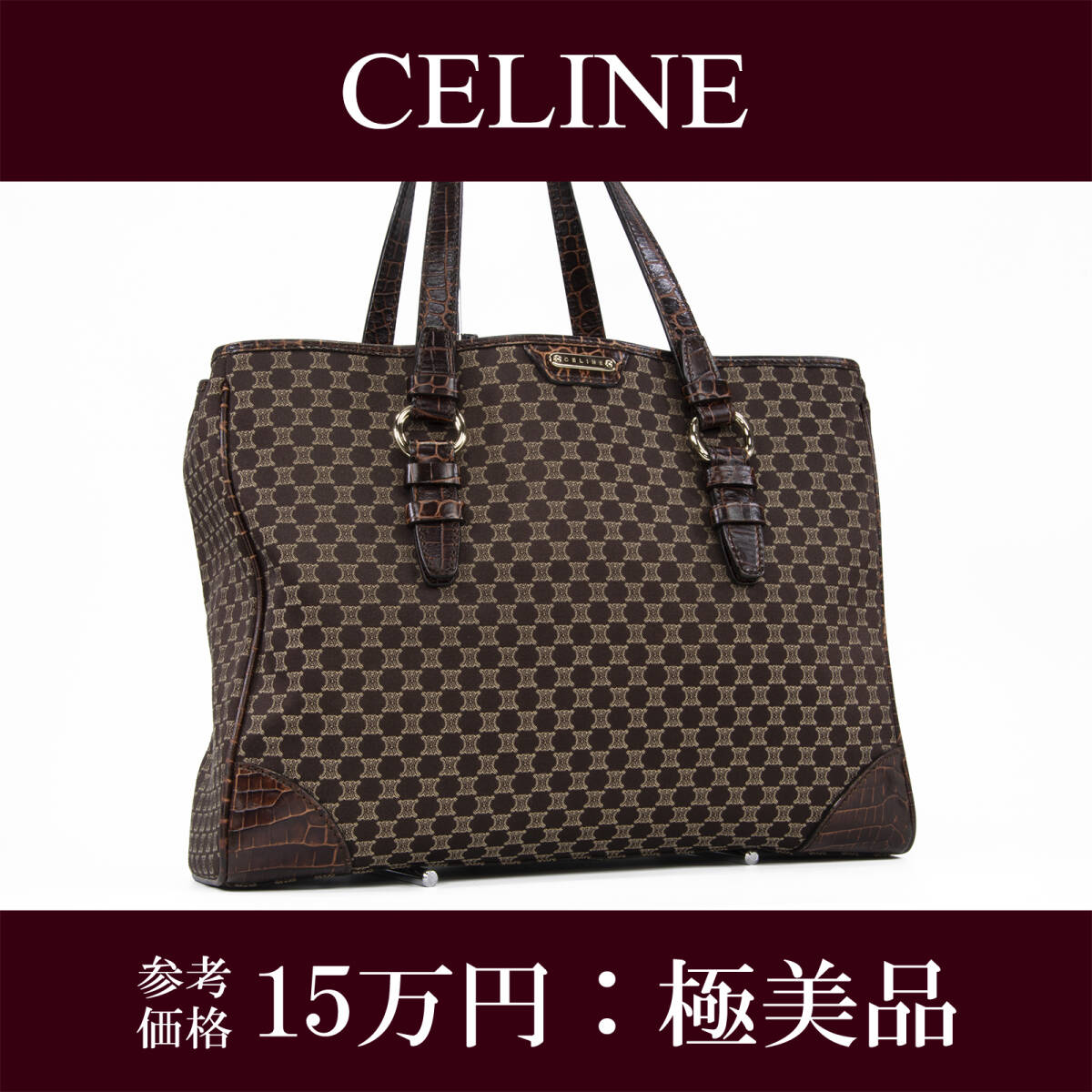 > 本物 送料無料 セリーヌ ハンドバッグ トートバッグ レディース マカダム 茶色 肩掛け A4対応 ブラゾン ロゴ マーク 鞄 バック 綺麗 F266