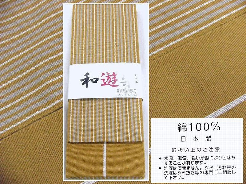 日本製 綿100% 織りの角帯 ストライプ柄 黄橡色 新品