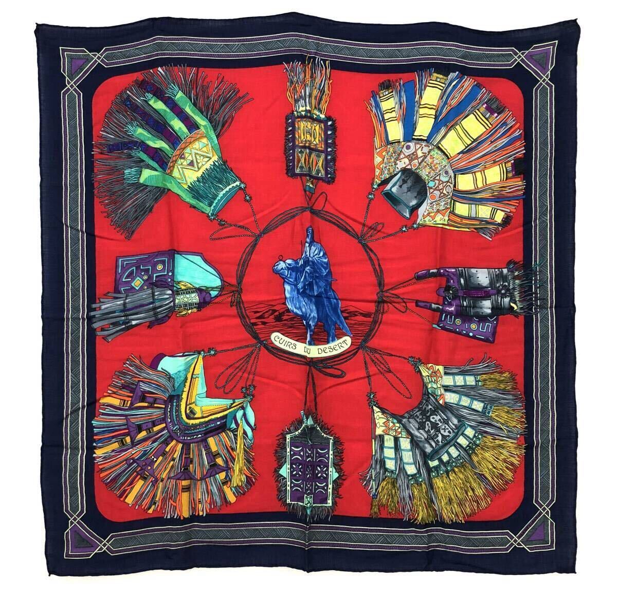 > 127 HERMES エルメス 大判 カシミヤストール 88x88 ショール 砂漠の首飾り柄 カシミヤ/シルク CUIRS DU DESERT レッド