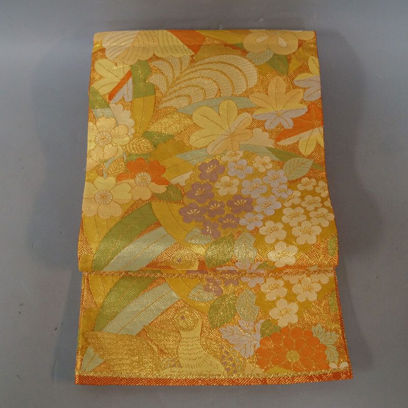 - ye09-六通柄袋帯 正絹 ゴールド 朱 泥金 京都 西陣 仕上がり品 着物帯 和服 和装