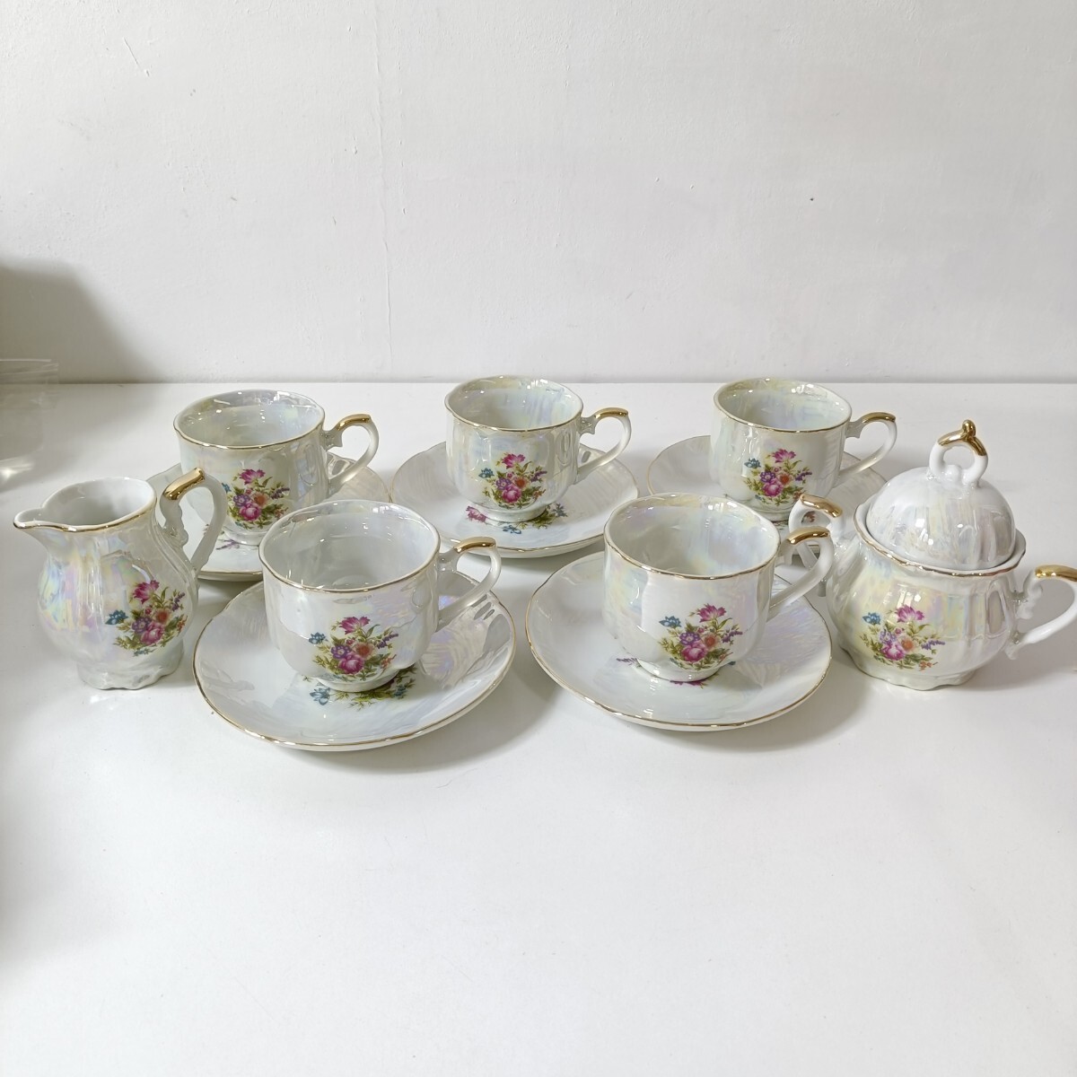 > 1960s~1970s K.H CHINA オーロラ釉 花柄 ティーセット 未使用品 [ビンテージ 昭和レトロ 日本製 茶器 カップ ソーサー シュガーポット]
