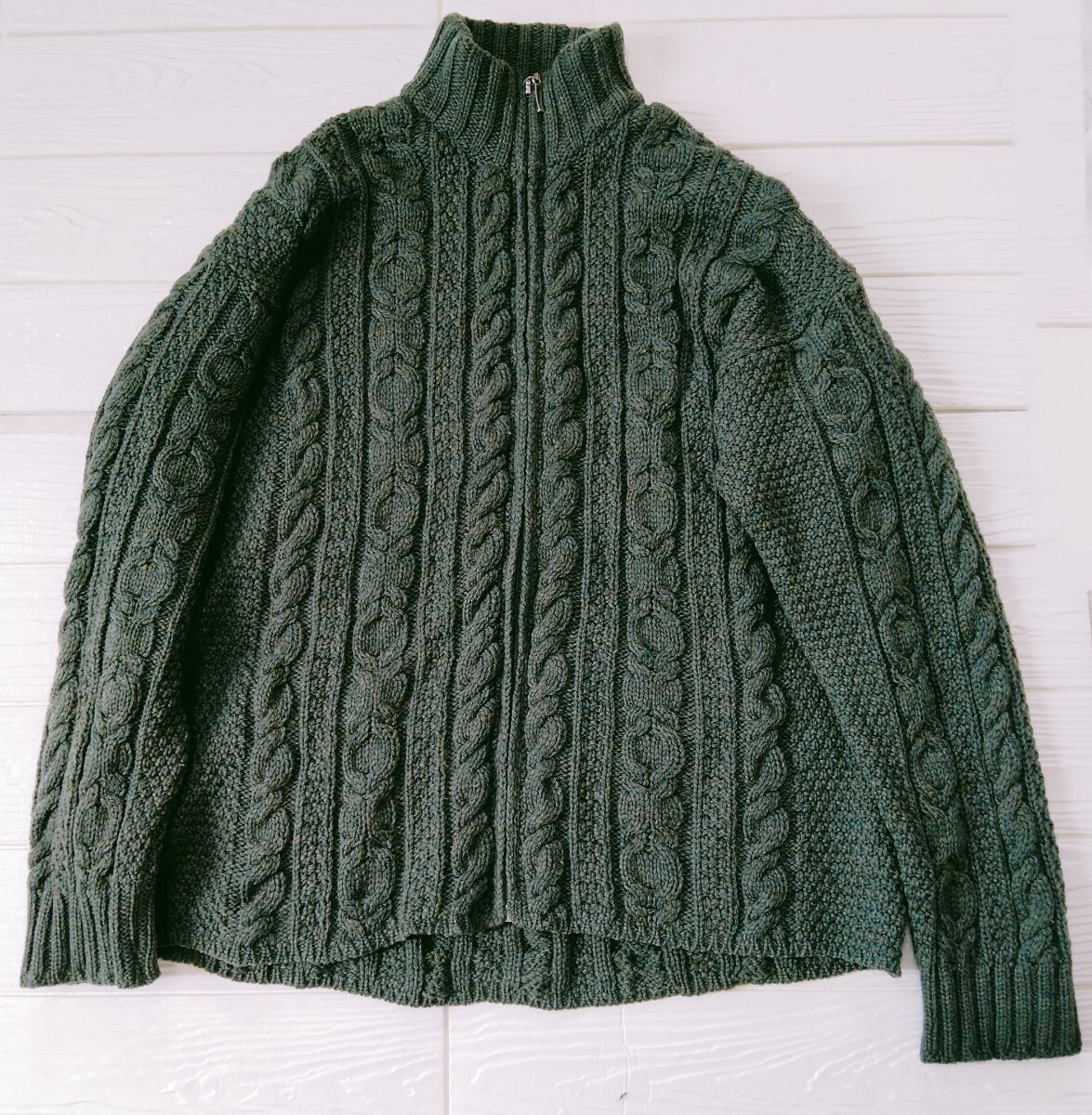 - アイルランド製*Aran Crafts アランクラフト*大きいサイズXL*フィッシャーマン*ジップアップカーディガン*セーター*アラン*モスグリーン