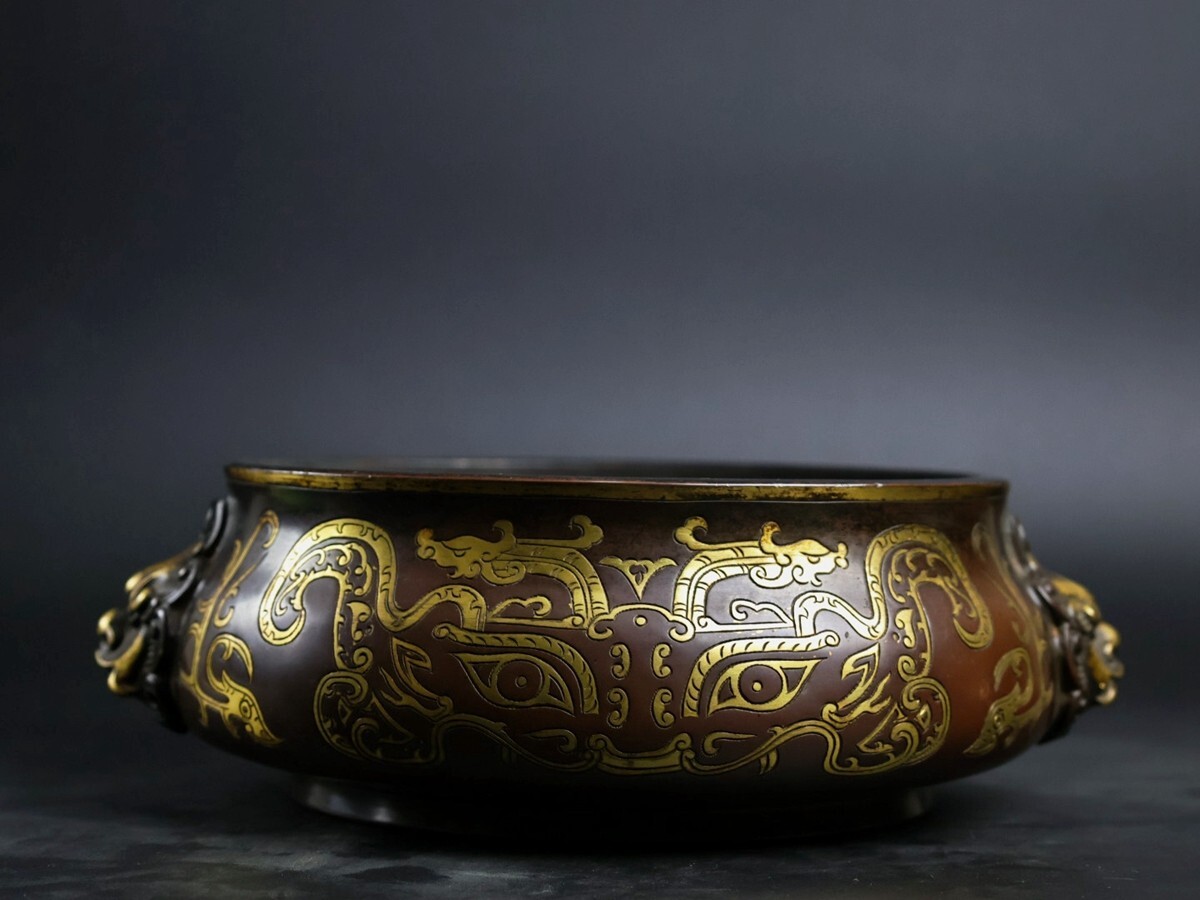 - 「明代 大明宣徳年製 古銅彫 塗金饕餮紋 獅耳老銅香炉」旧銅器 置物擺件 賞物 中国古美術 旧蔵出