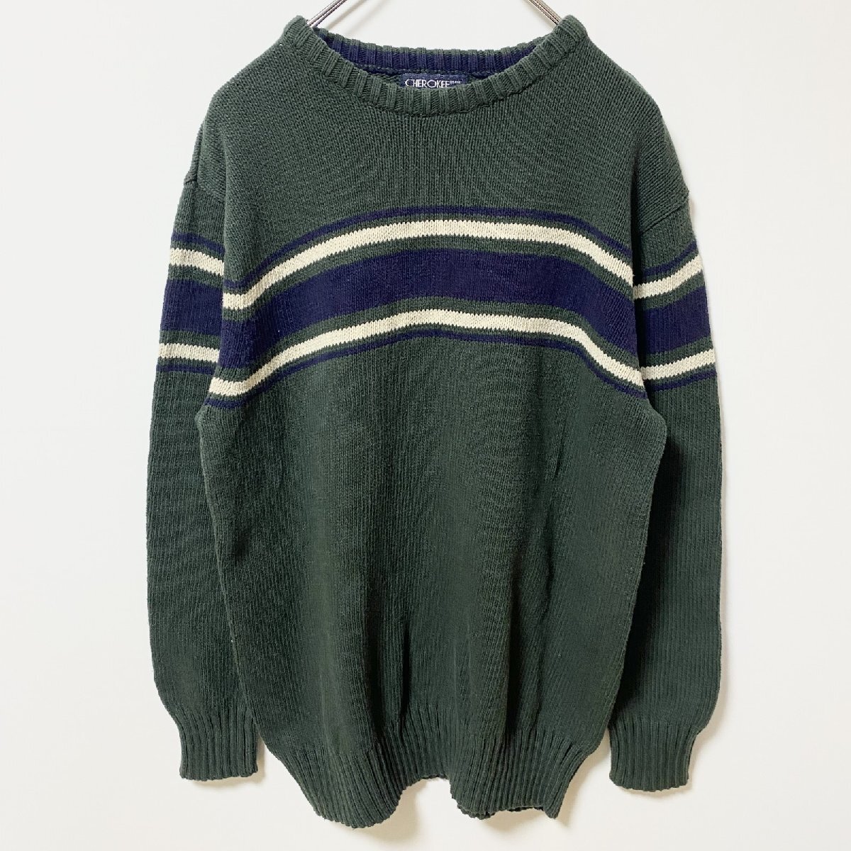 > 古着 used CHEROKEE チェロキー 長袖クルーネックニット セーター ラインデザイン 緑 グリーン 秋冬服 Lサイズ
