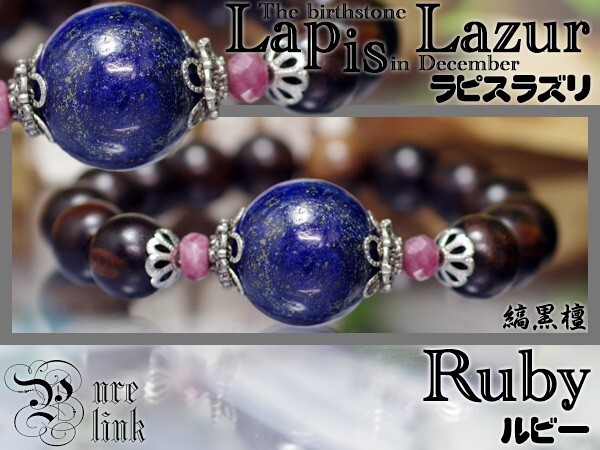 - 蒼き聖石『ラピスラズリ』貴石の王『ルビー』縞黒檀ハンドメイドブレス