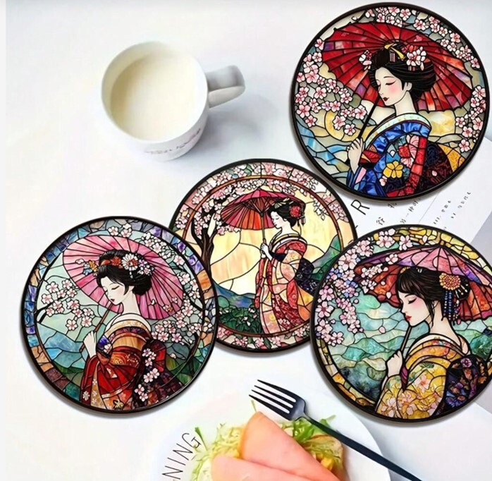 - 【舞子柄 4枚組 木製コースターセット】木材で作られた飲み物用のコースター 高品質 UV印刷 新品未使用品 サイズ:直径10㎝、厚み約3mm