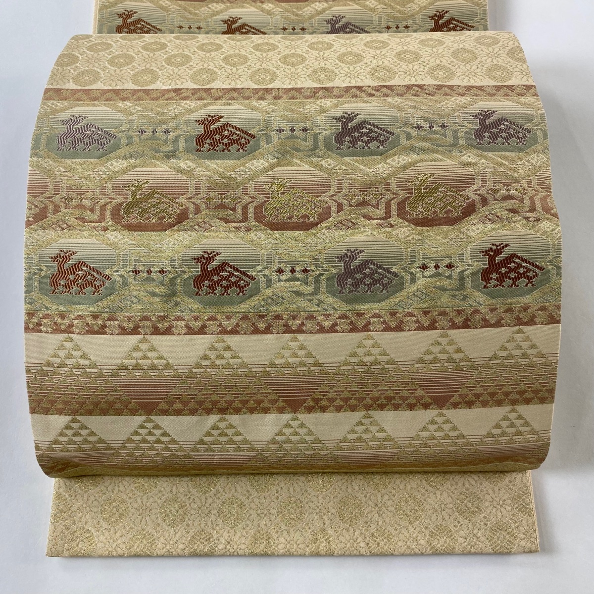 - 袋帯 秀品 有栖川文 鱗文 金糸 箔 ベージュ 六通 正絹 【中古】